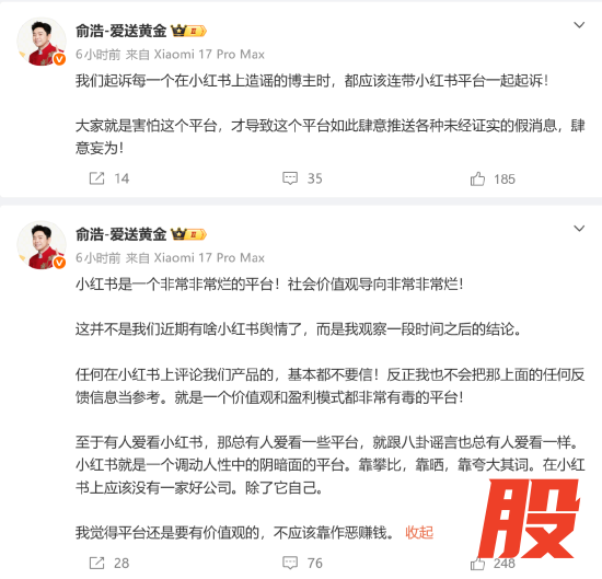 俞浩表示,至于有人爱看小红书,那总有人爱看一些平台,就跟八卦谣言也总有人爱看一样。小红书就是一个调动人性中的阴暗面的平台。靠攀比,靠晒,靠夸大其词。在小红书上应该没有一家好公司,除了它自己。